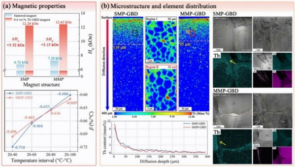 图 (a) 烧结和晶界扩散磁体的磁性能及矫顽力温度系数变化,(b)晶界扩散磁体的微观结构与元素分布